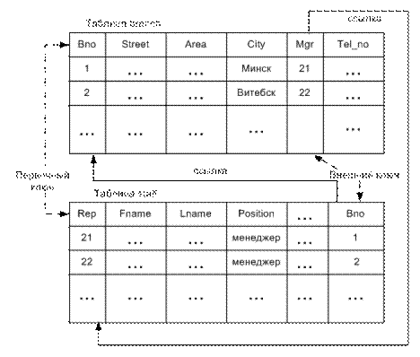 На представленном рисунке таблица staff содержит столбец bno– внешний ключ для таблицы branch. Таблица branch, в свою очередь может содержать столбец mgr (с информацией об управляющих отделений) – внешний ключ для таблицы staff. Как видно из рисунка, эти два отношения образуют ссылочный цикл. Любая строка таблицы staff имеет ссылку на строку таблицы branch, которая имеет ссылку на строку таблицы staff, и т.д.