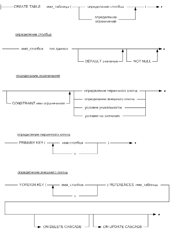 В стандартном SQL правил удаления, как и правил обновления всего четыре: RESTRICT, CASCADE, SET NULL и SET DEFAUL. Однако правила SET NULL и SET DEFAULT некоторыми СУБД вообще не поддерживаются, а правило RESTRICT не нуждается в явном указании, так как в большинстве случаев принимается по умолчанию. На синтаксической диаграмме для наглядности задания инструкции CREATE TABLE включено правило каскадного обновления (ON UPDATE CASCADE).