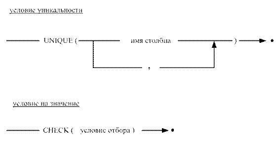 Условия уникальности и ограничения на значения столбцов. В соответствии со стандартом условие уникальности значений в каком-либо столбце, не выбранном в качестве первичного ключа, задается в предложении UNIQUE инструкции CREATE TABLE. Это дополнительное ограничение, которое позволяет СУБД автоматически следить за уникальностью данных в указанном столбце при заполнении таблицы.