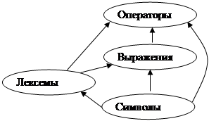 В тексте на любом естественном языке можно выделить четыре основных элемента: символы, слова, словосочетания и предложения. Алгоритмический язык также содержит такие элементы, только слова называют лексемами (элементарными конструкциями ), словосочетания – выражениями, предложения – операторами. Лексемы образуются из символов, выражения из лексем и символов, операторы из символов выражений и лексем (Рис. 1.1)