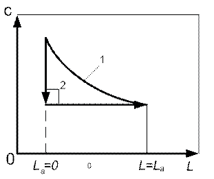 Рис.6.4 Изменение концентрации в потоке по длине аппарата идеального вытеснения (1) и идеального смешения (2).