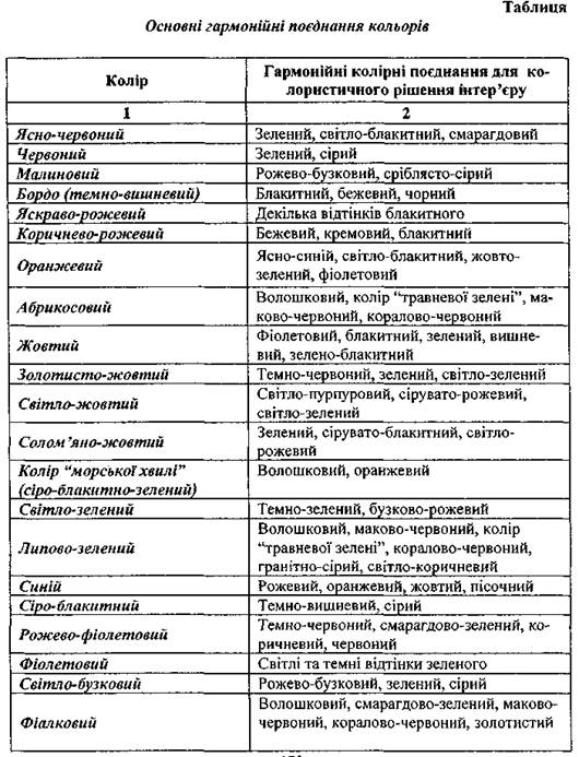 Поєднання кольорів може бути різноваріантним. Проте, не всі кольорові комбінації є гармонійними, приємними, естетично привабливими. Найбільш поширеними прийомами комбінування кольорів у дизайні інтер 'єру є такі: