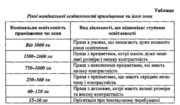 Найбільш сприятливим освітленням приміщення вважається освітлення в 200 лк. Проте, виконання різних видів роботи для людини потребує різного ступеня освітленості.