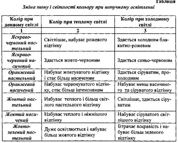 Ступінь світлонасиченості приміщення залежить не тільки від загального колориту інтер 'єру, а й від якості його штучного освітлення. Слід запам'ятати деякі оптико-естетичні та психологічні ефекти такого освітлення: