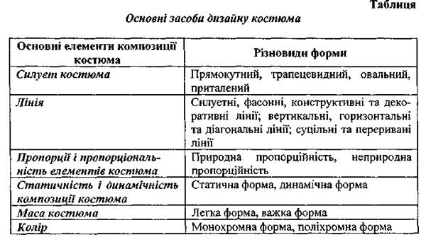 Використовуючи різноманітні, формоутворюючі та гармонізуючі, засоби композиції, художник-модельєр створює цілісний художньо-ідейний образ - костюм, у якому узгоджені між собою усі елементи, і котрий пасує своєму власникові. Геометричний вид форми, характер її розчленування лініями, художні властивості тканини та її забарвлення виступають у ньому формоутворюючими композиційними засобами. А пропорції, масштаб та масштабність, статичність чи динамічність форми, метроритмічні властивості, характер підпорядкованості усіх елементів костюма є чинником гармонізації його композиції. Знання, досвід, фантазія та інтуїція дизайнера допомагають йому створювати вбрання, в якому "відчуваються" смак і стиль.