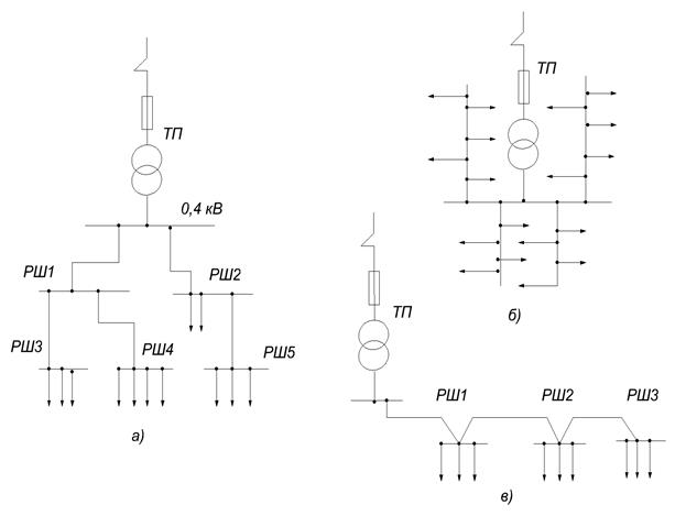 Распределение электроэнергии внутри цеха после получения её от цеховой ТП распределяется при напряжении до 1000 В. Цеховые сети систем трёхфазного тока напряжением до 1000 В выполняют по радиальной (рис. 4.3. а), магистральной (рис. 4.3.в) и комбинированным схемам. В чистом виде радиальная и магистральная схема применяется редко, в зависимости от характера производства, условий окружающей среды сети выполняются комбинированными. При сравнительно малых мощностях приёмников на некоторых участках цеха устанавливаются распределительные шкафы (РШ), которые питаются от одной линии.