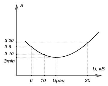 На рис. 5.2. изображена кривая зависимости годовых затрат в функции напряжения, где минимальные затраты соответствуют нестандартному напряжению.
