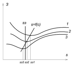 1, 2, 3 зависимости З=f(s) для различной стоимости электроэнергии