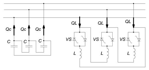 В сетях с резкопеременной ударной нагрузкой, а так же для плавной регулировки уровня компенсации рекомендуется применение комбинированных быстродействующих источников реактивной мощности (рис. 9.2). Регулирование индуктивности в данном случае осуществляется тиристорами VS.