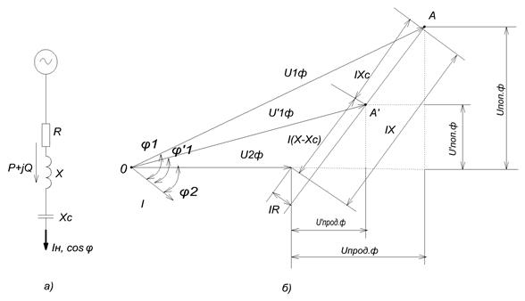 При заданном векторе фазного напряжения у потребителя U2ф напряжение на источнике питания определяется вектором U1ф (точка А). Если в линию включить последовательно конденсаторы с реактивным сопротивлением Хс , то падение напряжения в реактивном сопротивлении составит I(X-Xc) и составляющие падения напряжения будут равны: