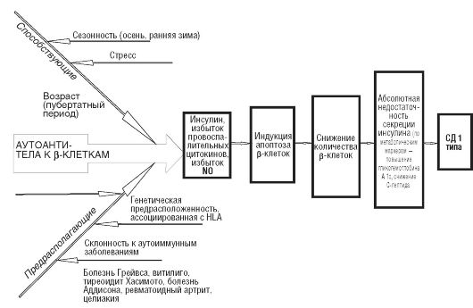 заболевания обусловлен сочетанием антигенов DR3+DR4. В пользу генетической предрасположенности этой формы диабета свидетельствует сочетание ее с другими аутоиммунными заболеваниями (болезнь Грейвса, тиреоидит Хасимото, целиакия, витилиго, болезнь Аддисона, ревматоидный артрит). Таким образом, в основе СД 1 типа лежит генетически обусловленный дисбаланс отдельных популяций иммунокомпетентных клеток.