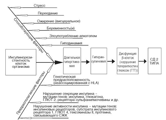 Рис. 12-24.Этиологические и патогенетические факторы развития сахарного диабета (СД) 2 типа. ГЛЮТ - глюкозный транспортер, ГТТ - глюкозотолерантный тест, СЖК - свободные жирные кислоты, HLA (human leukocytes antigen) - человеческий лейкоцитарный антиген