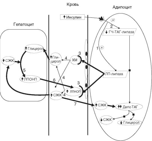 Несмотря на то что транспорт глюкозы в клетки в условиях ИР нарушен, липогенетическое действие инсулинана клетки инсулинозависимых тканей может сохраняться и заключается в следующем: