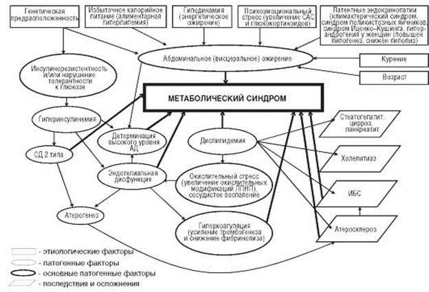 Представленные сложные взаимосвязи патогенетических факторов, участвующих в механизме нарушений регуляции углеводного и жирового обмена при СД 2 типа, позволили G. Reaven в 1988 г. сформулировать концепцию метаболического синдрома,основными компонентами которого является ИР тканей и гиперинсулинемия, нарушение толерантности к глюкозе и развитие СД 2 типа, абдо-
