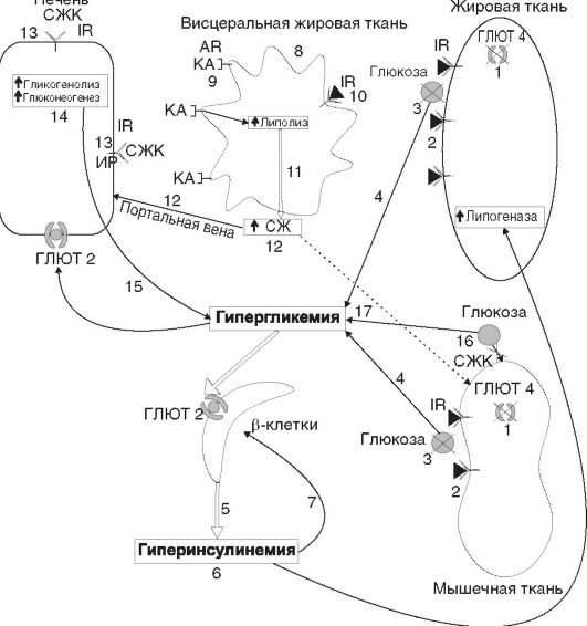 Рис. 12-27.Роль нарушений ГЛЮТ 4 и висцерального ожирения в развитии инсулинорезистентности: 1 - наследственный дефект ГЛЮТ 4; 2 - инсулиновый сигнал не работает (ГЛЮТ 4 остаются в клетках инсулинзависимых тканей); 3 - транспорт глюкозы в клетки инсулинзависимых тканей прекращается; 4 - гипергликемия; 5 - увеличение продукции инсулина β-клетками; 6 - гиперинсулинемия и усиление липогенеза; 7 - истощение β-клеток; 8 - висцеральное ожирение; 9 - увеличение количества β3-адренорецепторов; 10 - снижение количества рецепторов к инсулину; 1l - усиление липолиза в результате действия КА (высокие концентрации КА при действии психогенных факторов); 12 - повышение СЖК в портальной вене печени; 13 - экранирование рецепторов к инсулину СЖК и ИР на уровне печени; 14 - отмена угнетающего действия инсулина на гликогенолиз и глюконеогенез в печени; 15 - гипергликемия натощак; 16 - конкуренция СЖК за поступление глюкозы в мышечные клетки; 17 - гипергликемия
