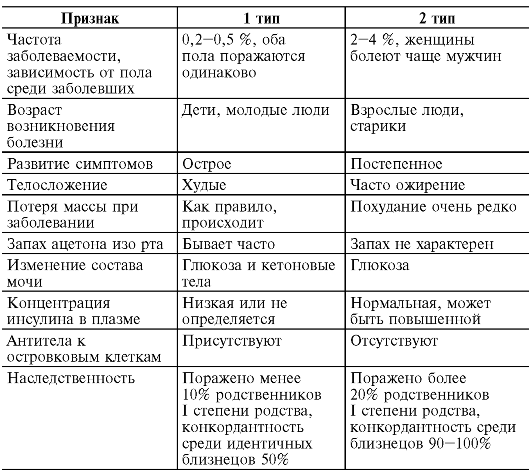 Таблица 12-4.Основные признаки сахарного диабета 1 и 2 типов