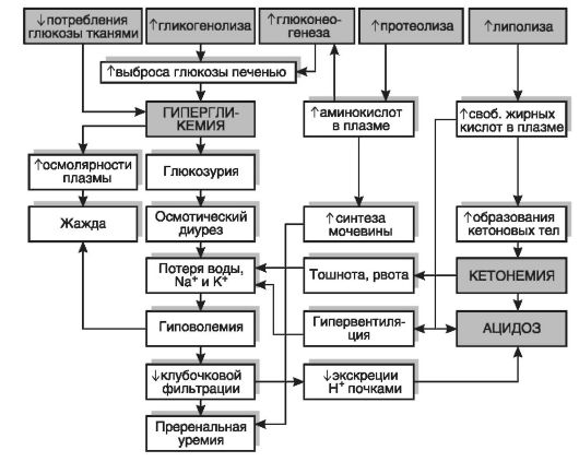 Ведущие патогенетические звенья диабетического кетоацидоза, учитывающие нарушения всех видов обмена, представлены на интегральной схеме (рис. 12-28).