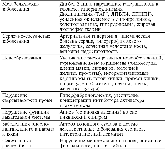 У тучных людей старше 50 лет смертность увеличивается на 50% по сравнению с лицами, не имеющими ожирения. У женщин с ожирением чаще встречаются рак эндометрия, яичника, шейки матки, желчного пузыря и молочной железы, у мужчин - рак предстательной железы и толстой кишки, снижение потенции. Жировая ткань, составляющая в норме 15-20% от массы тела у мужчин и 20-29% у женщин, - это метаболически активное образование.