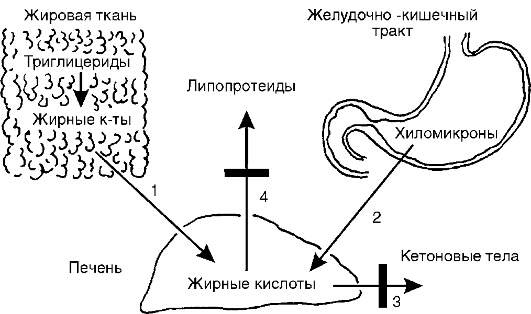 Причины жировой инфильтрации печени: 1 - усиленный выход неэтерифицированных жирных кислот из жировой ткани; 2 - интенсивное длительное поступление хиломикронов из кишечника в кровь, а затем в печень; 3 - задержка окисления жирных кислот в печени до кетоновых тел; 4 - задержка выхода из печени пре-β- и β-липопротеинов. Затемненные прямоугольники - места нарушения процесса
