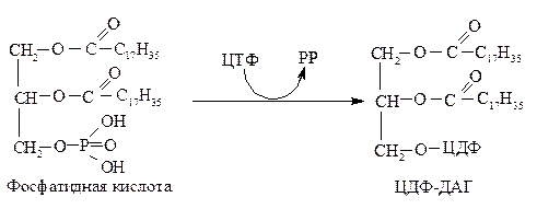 а) активированием ДАГ цитидинтрифосфатом, в результате этой реакции образуется ДАГ—ЦДФ, к которому затем присоединяются азотсодержащие вещества;