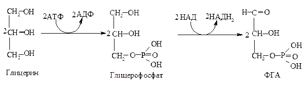 В первой реакции используется 2 молекулы глицерина, которые фосфорилируются под действием глицеролкиназы. Во второй реакции происходит окисление глицерофосфата пиридинферментом, в результате реакции образуются 2 молекулы фосфоглицеринового альдегида (ФГА). Одна из молекул ФГА изомеризуется в ДОАФ. В дальнейшем молекулы ДОАФ и ФГА конденсируются с образованием фруктозо-1,6-дифосфата – эта и последующие реакции относятся к реакциям глюконеогенеза. Фруктозо-1,6-дифосфат (Фр-1,6-дф) под действием соответствующего фермента (фр-1,6-дф-аза) дефосфорилируется, превращаясь во фруктозо-6-фосфат.