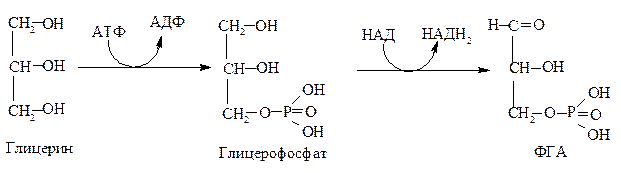 Глицерин может использоваться как источник энергии. Фосфорилируясь, глицерин превращается в глицерофосфат, (фермент — глицеринкиназа), последний окисляется НАД- зависимой дегидрогеназой с образованием ФГА, который может вступить в гликолиз с образованием ПВК (см. реакции гликолиза):