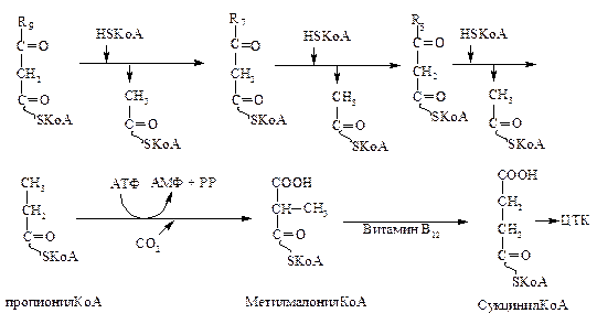 Они окисляются также путем β-окисления, только на последнем этапе расщепления образуется 1 молекула пропионил-КоА и 1 молекула АУК, а не 2 молекулы АУК.