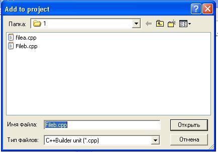 5. Включаємо файл fileb.cpp до складу проекту. Це необхідно зробити, оскільки навіть тоді, коли він записаний у тій же папці, що й головний файл проекту, компілятор його автоматично не відшукає. З цією метою використовуємо команду Add to project…