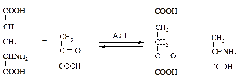 Переаминирование – это обратимый процесс переноса аминогруппы с аминокислоты на кетокислоту с образованием заменимой аминокислоты. Чаще всего источником аминогруппы служит глутаминовая кислота. Ферментом, катализирующим этот процесс, являются аминотрансферазы (трансаминазы), коферментом которых является витамин пиридоксальфосфат (В6).