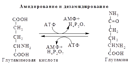 А) Аммиак используется для образования соответствующих амидов. Реакция носит название амидирование. В организме человека процесс амидирования происходит с глутаминовой и, реже с аспарагиновой, кислотами. Нетоксичные глутамин (глн) и аспарагин (асн), образовавшиеся в тканях, с током крови приносятся в печень, где подвергаются дезамидированию, т. е. распадаются на аммиак и соответствующую дикарбоновую кислоту, прямая и обратная реакции протекают с затратой энергии АТФ.