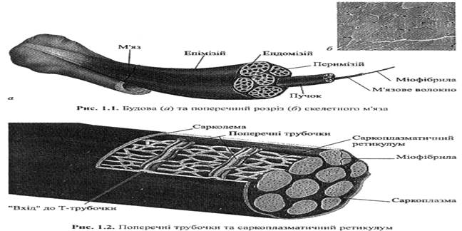 Рис. 1.1. Будова (а) та поперечний розріз (б) скелетного м'яза