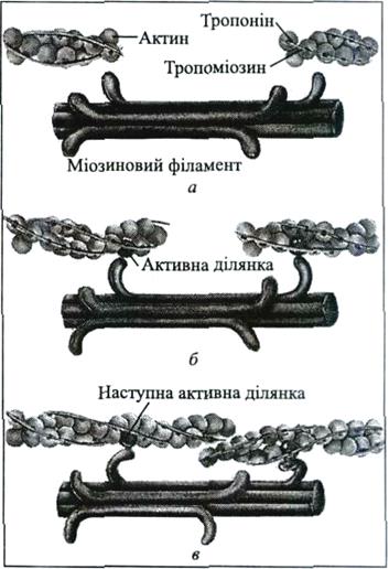 Роль кальцію. Окрім деполяризації мембрани волокна, електричний імпульс проходить через усю сітку трубочок волокна (Т-трубочки та саркоплазматичний ретикулум) у внутрішню частину клітини. Надходження електричного імпульсу призводить до виділення значної кількості іонів кальцію з саркоплазматичного ретикулума у саркоплазму (рис. 1.7, б). Вважають, що у стані спокою молекули тропоміозину знаходяться над активними ділянками актинових філаментів, запобігаючи «прив'язування» міозинових голівок. Після вивільнення іонів кальцію з саркоплазматичного ретикулума вони зв'язуються з тропоніном на актинових філаментах. Вважають, що тропонін, котрий має виражену спорідненість з іонами кальцію, потім починає процес скорочення, «піднімаючи» молекули тропоміозину з активних ділянок актинових філаментів (рис. 1.7,в). Оскільки тропоміозин звичайно «приховує» активні ділянки, він блокує взаємодію поперечних містків міозину з актиновим філаментом. Але як тільки тропонін та кальцій «піднімають» тропоміозин з активних ділянок, голівки міозину починають прикріплюватися до активних ділянок актинових філаментів.