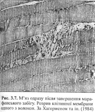 На рис. 3.8 показано зміни скоротливих філаментів та Z-ліній перед та після пробігання марафонської дистанції. Згадаймо, що Z-лінії — це місце контакту скоротливих білків. Вони забезпечують структурну підтримку передачі зусилля при активації м'язових волокон. Як видно з рис. 3.8, б (після забігу), внаслідок ексцентричних рухів або розтягнення напружених м'язових волокон Z-лінії виявилися розведеними в боки.