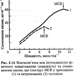 При переході від стану спокою до виконання фізичного навантаження потреба в енергії зростає. Метаболізм збільшується прямо пропорційно збільшенню інтенсивності роботи. Стикаючись із зростаючими потребами в енергії, наш організм поступово досягає межі споживання кисню. У цей момент, як слідує з рис. 4.14, споживання кисню досягає піку і залишається постійним або навіть трохи знижується, незважаючи на зростаючу інтенсивність роботи. Цей піковий показник являє собою аеробну здатність, максимальне споживання кисню або МСК — кращий показник рівня кардіореспіраторної витривалості та аеробної підготовленості.