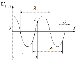 Пружна хвиля називається синусоїдальною (або гармонічною), якщо відповідні їй коливання частинок середовища є гармонічними. На рис. 1 показана синусоїдальна поперечна хвиля, яка поширюється зі швидкістю υ уздовж осі х, тобто показана залежність між зміщенням U(x,t) частинок середовища, у хвильовому процесі, і відстанню х цих частинок відджерела коливань для будь-якого фіксованого моменту часу t.