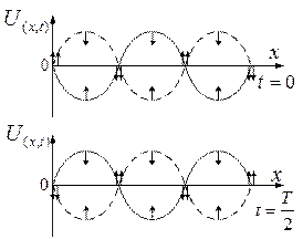 На рис. 2 наведено характер руху частинок середовища при встановленні в ньому поперечної стоячої хвилі через проміжок часу T/2. Стрілками показано напрямки руху частинок, які викликані тією чи іншою хвилею.