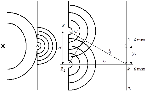 Когерентні хвилі від двох вторинних точкових джерел світла B1 і B2 накладаються і на екрані E створюють інтерференційну картину з перерозподілом інтенсивності. В точці накладання хвиль буде спостерігатись максимум інтенсивності, якщо в оптичній різниці ходу цих хвиль
