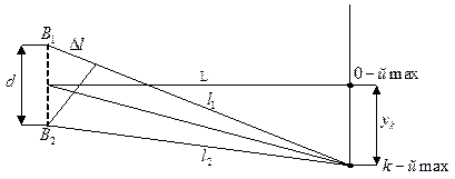 Розглянемо більш детально дослід Юнга. Нехай відстань між щілинами B1 і B2 дорівнює d, а відстань від щілин до екрана