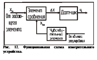 Чтобы выработать сигнал ошибки, измерительное устройство должно включать (рис. 12): чувствительный, или воспринимающий, элемент, измеряющий действительное значение регулируемой величины xвых; элемент сравнения, который вырабатывает отклонение (рассогласование)