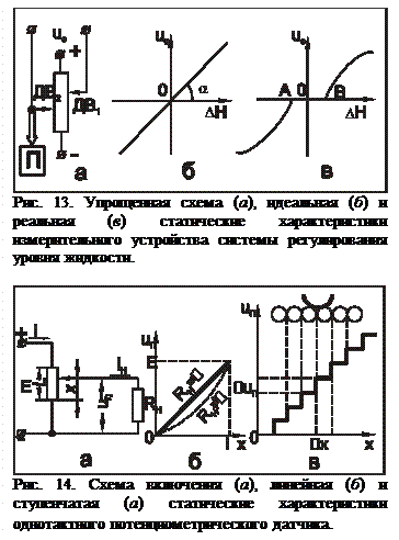 должен быть постоянным, а следовательно, статическая характеристика - линейной. Однако измерительные устройства всегда имеют зону нечувствительности, определяемую минимальным значением измеряемой величины, которую еще можно измерить. Так, ширина этой зоны АВ для измерителя уровня жидкости (рис. 13, в) зависит от величины силы трения, необходимой для перемещения движка
