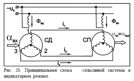 При индикаторном режиме сельсины соединяют по схеме, приведенной на рис.20. Рассмотрим работу этой схемы. В обмотках роторов СП и СД наводятся э.д.с. Если сельсины согласованы (