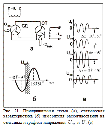 Данная зависимость отражает статическую характеристику измерителя угла рассогласования на сельсинах, которая, как видно из рис. 21,б, нелинейна, т.е. нет пропорциональной зависимости между