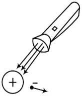 Куди діваються електрони, якщо їх вибивають фотони? Деяка кількість електронів під дією світла вилітає за межі металу, від чого метал набуває позитивного заряду. Зрештою позитивний заряд металу стане настільки великим, що максимальної кінетичної енергії, якої набув електрон, не вистачить, щоб летіти в безмежність. Що тоді буде відбуватися? Електрони вилітають за межі металу і тут же повертаються назад. Це означає, що всякий шматок металу при освітленні (рис.9) повинен мати деякий позитивний заряд, і що він оточений хмаркою електронів біля його поверхні.