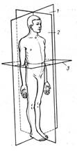 Для загального орієнтування й уточнення локалізації різних частин і органів тіла людини користуються площинами, проведеними в трьох взаємно перпендикулярних напрямках: стріловому - (площина спрямована спереду назад — стрілова), лобовому - (площина розташована паралельно площині лоба — лобова, або вінцева) і горизонтальному (площина, що перетинає тіло впоперек) (див. мал. 1). Стрілова площина, проведена чітко по середині тулуба, називається серединною.