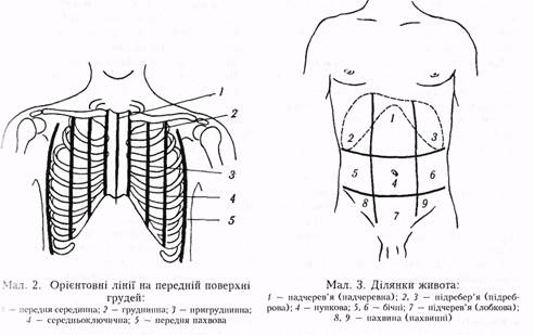 Для кращого орієнтування в розташуванні та проекції внутрішніх органів на тулубі уявно проводять передню і задню серединні лінії(мал. 2). Потім на