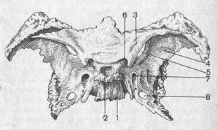 Мал.5. Клиновидна кістка (вигляд зверху): 1-тіло; 2-ямка для гіпофізу;