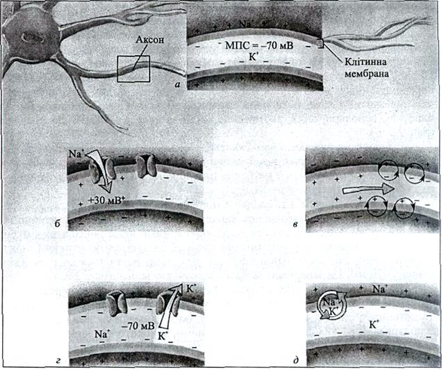 Рис. 2.2. Послідовність явищ у виникненні потенціалу дії: а — стан спокою; б — деполяризація; в — поширення потенціалу дії; г — реполяризація; д — дія натрій-калієвого насоса
