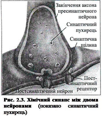 Зв'язок нейронів один з одним здійснюється за допомогою синапсів. Синапс — це ділянка передачі імпульсу з одного нейрона на інший. Найхарактернішим видом синапсів є хімічний синапс, котрий ми і розглянемо. Як видно з рис. 2.3, синапс між двома нейронами включає кінцеву частину аксона нейрона, що несе імпульс; рецепти іншого нейрона та простір між цими структурами. Нейрон, що посилає імпульс через синапс, називається пресинаптичним, а закінчення аксона — пресинаптичними закінченнями.