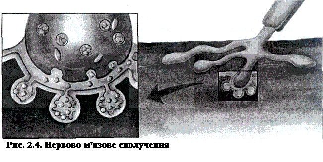 У нервово-м'язовому з'єднанні імпульс сприймає м'язове волокно (рис. 2.4). У місці наближення закінчень аксона до м'язового волокна воно має увігнутість. Утворювана таким чином западина називається синоптичним жолобом. Простір між нейроном та м'язовим волокном поділено синоптичною щілиною.