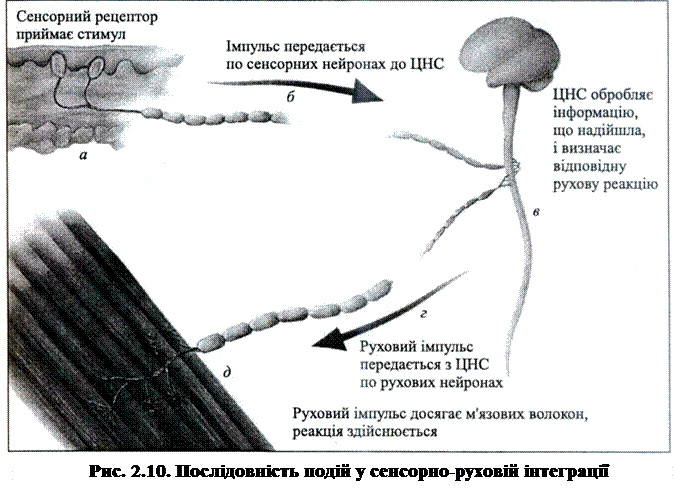 Цей процес, котрий називається сенсорно-рухового інтеграцією, показано на рис. 2.10. Щоб тіло прореагувало на сенсорний стимул, сенсорний та руховий відділи нервової системи мають функціонувати разом у такій послідовності: